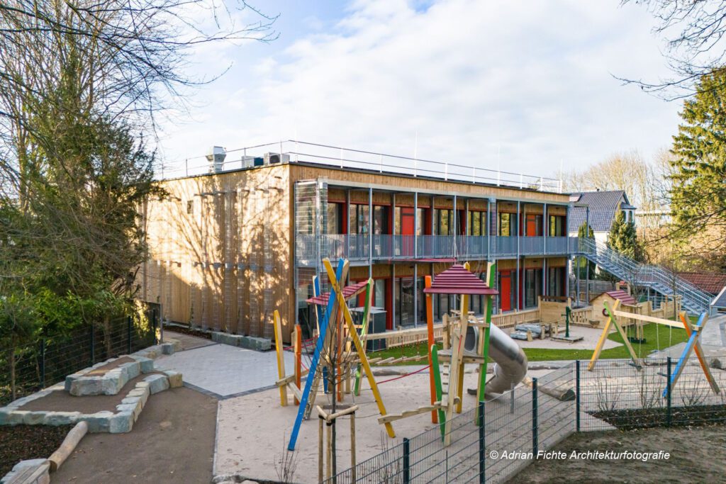 Die Einrichtung wurde in Elementbauweise errichtet und erfüllt den Passivhausstandard. Im Mittelpunkt stand von Beginn an das Ziel, ein zukunftsfähiges und nachhaltiges Gebäude zu schaffen. Eine Photovoltaikanlage sorgt für die Eigenstromerzeugung, Luft-Wärmepumpen übernehmen die Heizung und Temperierung und die Dach- sowie Fassadenbegrünung verbessern das Mikroklima. Die Außenfassade ist mit einer hinterlüfteten, vertikalen Holzverkleidung gestaltet, die den Nachhaltigkeitsgedanken unterstreicht. Sie verleiht dem Gebäude eine natürliche Ausstrahlung und wird durch farbige Elemente lebendig aufgelockert.