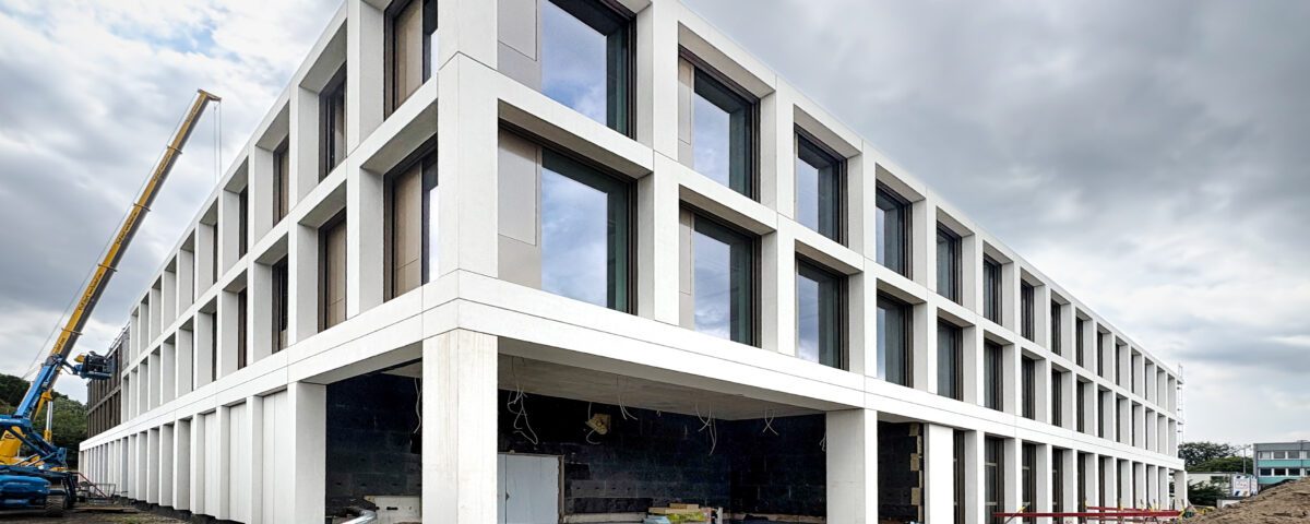 Die Arbeiten an der „Architekturbetonfassade“ starteten vor der Herstellung der Außenanlagen im Mai 2025 an. Hierfür werden vorgefertigte Betonfassadenelemente mittels eines Autokrans vor die Aluminium-Fensterelemente gehängt. Die Fassadenflächen auf der Nordseite sind vollständig, auf der Ostseite zur Hälfte abgeschlossen. Sobald die östliche Fassade montiert ist, folgt die Montage der Fassadenelemente auf der Südseite. Im Tiefbaubereich erfolgt die Herstellung der Ver- und Entsorgungsleitungen. Der Innenhof sowie weitere Außenanlagen werden im weiteren Verlauf realisiert und die entsprechenden Vergabeverfahren sind derzeit im Gange.