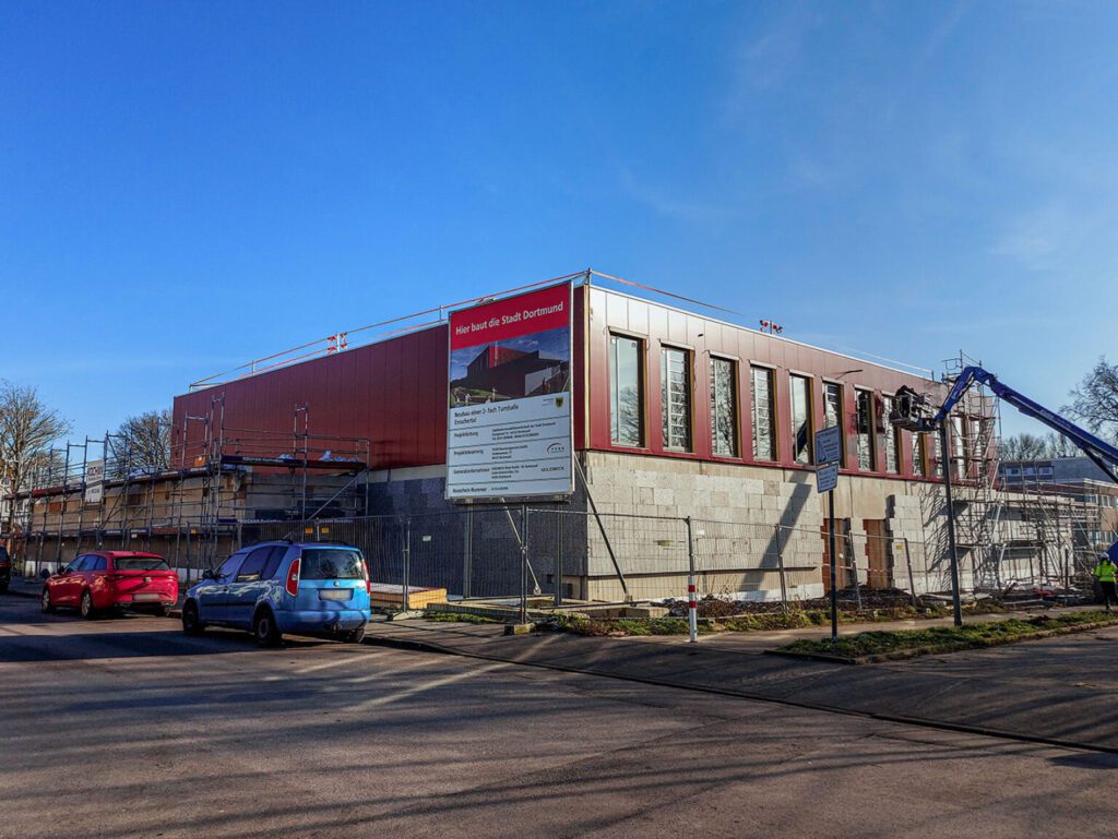 Die Fertigstellung der neuen Zweifach-Turnhalle in Dortmund ist für Herbst 2025 das geplant. Das Projekt liegt gut im Zeitplan und nimmt immer mehr Gestalt an. Die Turnhalle Emschertal wird schon bald ein moderner Ort für Sport und Bewegung sein.