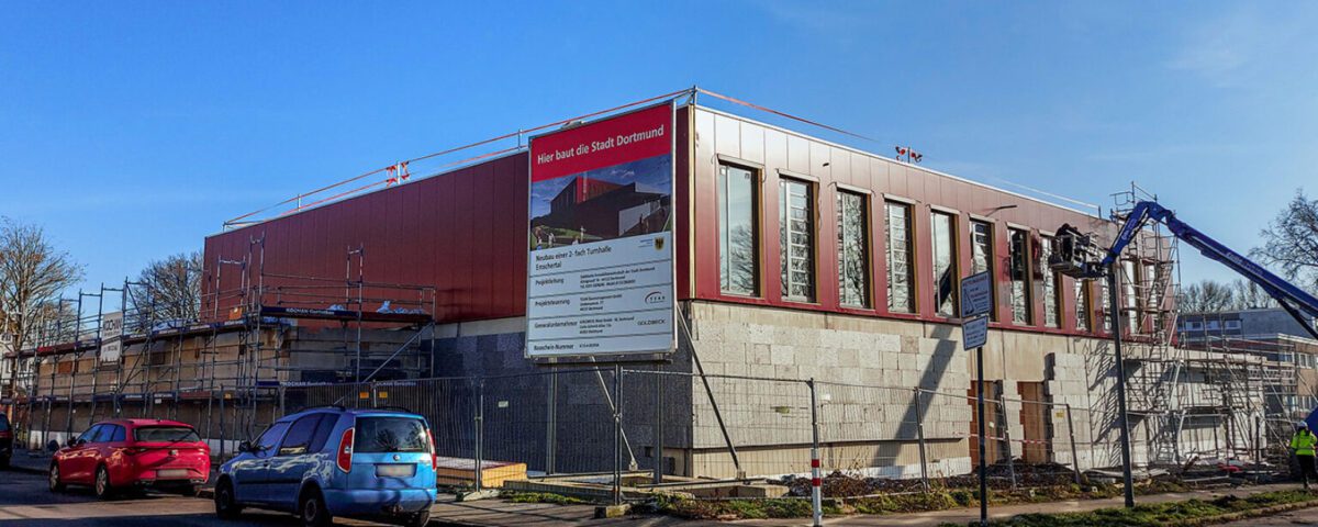 Der Neubau der Zweifach-Sporthalle für die Emschertal Grundschule in Dortmund macht deutliche Fortschritte. Für die Stadt Dortmund wird das Projekt durch TEAM Baumanagement begleitet, welches die Projektsteuerung übernimmt.