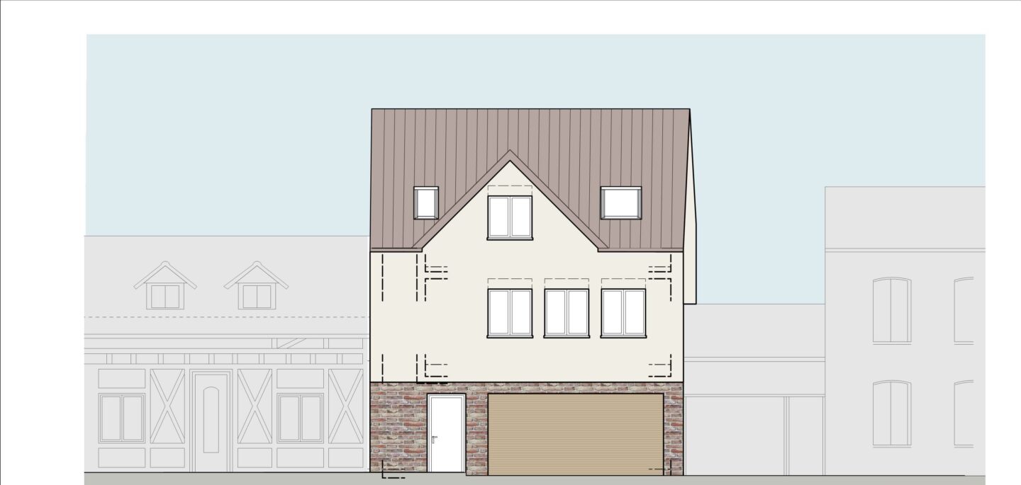 Das Erdgeschoss wird in Massivbauweise errichtet und mit Feldbrandsteinen verkleidet. So passt sich das Zweiparteienhaus in Swisttal-Heimerzheim an den Charakter der bestehenden Gebäude im Ortskern an.
