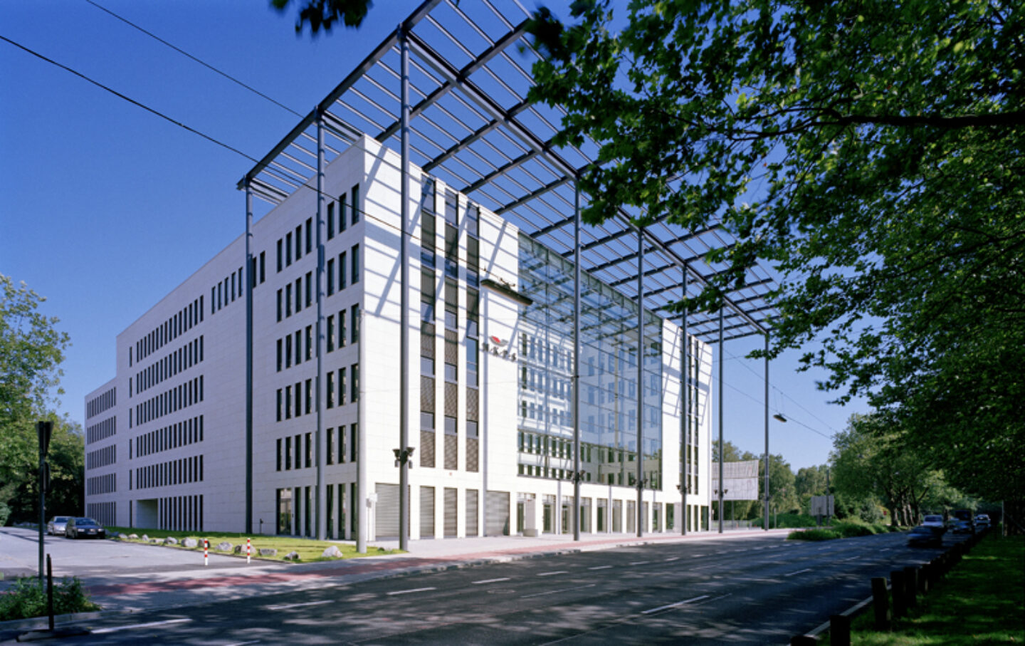Das Objekt wird über 4 Treppenhäuser erschlossen, die jeweils an der Außenfassade angeordnet und mit je 2 Personenaufzügen ausgestattet sind. Von jedem Treppenhaus sind je Geschoss mögliche Mietbereiche unterschiedlicher Größe erschlossen. Das Objekt verfügt über ein 1. UG zur Aufnahme der Tiefgarage und für die Technikflächen sowie ein 2. UG für die Aufnahme von Lager- und Archivflächen. Parallel zur Bundesstraße 1 (Rheinlanddamm) erhielt das Objekt eine Flugdachkonstruktion aus Stahlelementen.