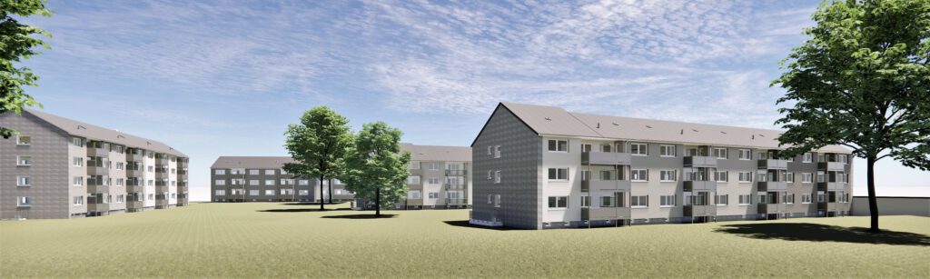 Zusätzlich zu der energetischen Sanierung und Modernisierung der Bestandsgebäude ist eine Neugestaltung der weiträumigen Außenanlagen inkl. der Herstellung von Feuerwehrzufahrten und der Erneuerung der Garagen vorgesehen. Ein Generalunternehmen führt die Maßnahmen an den Bestandgebäuden aus, der auch Teile der Planungsleistungen übernimmt. Die Maßnahmen der Außenanlagen werden separat per Einzelvergabe vergeben.