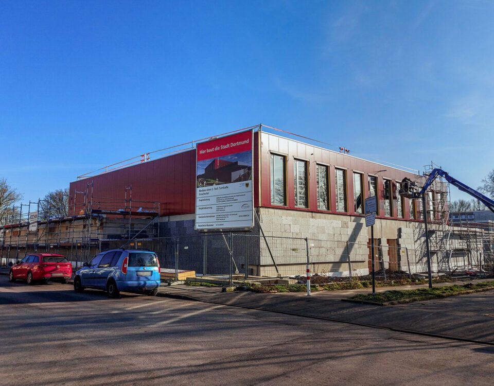 Mittebericht zur Turnhalle Emschertal in Dortmund: Baufortschritte beim Neubau
